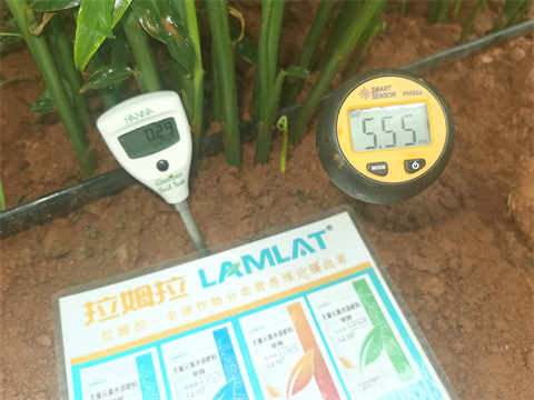 使用一次后,當秦大哥再次來到姜地觀看,發(fā)現之前的癥狀都沒有了,可讓秦大哥樂壞了,由衷地表示,拉姆拉翠姆水溶肥是大廠家,值得信賴,而目前的長勢也正是他所希望的。又過了幾天,技術人員剛好來回訪秦大哥,到他地里發(fā)現黃姜的長勢更好了,團棵快,植株健壯,葉片翠綠肥厚,黃葉現象幾乎沒有了,姜塊膨大速度也快,缺素黃葉情況明顯減少發(fā)生,新葉已基本轉綠,土壤酸化也有效改善,現場測量PH=5.55,EC=0.29。